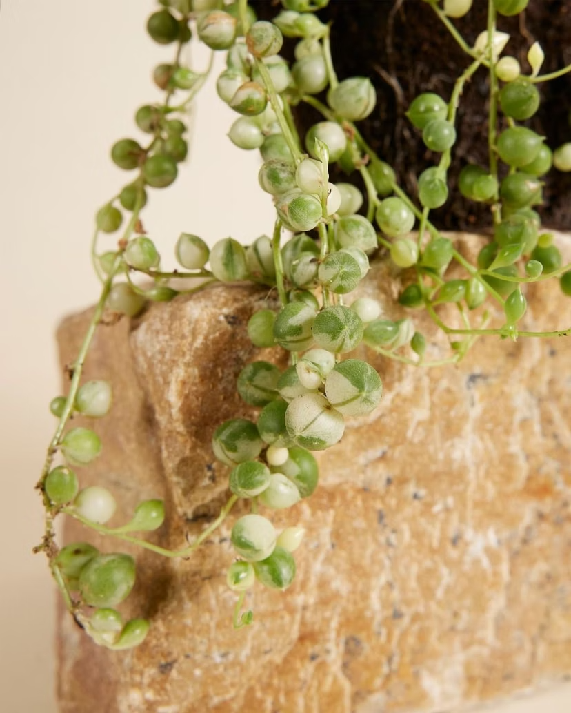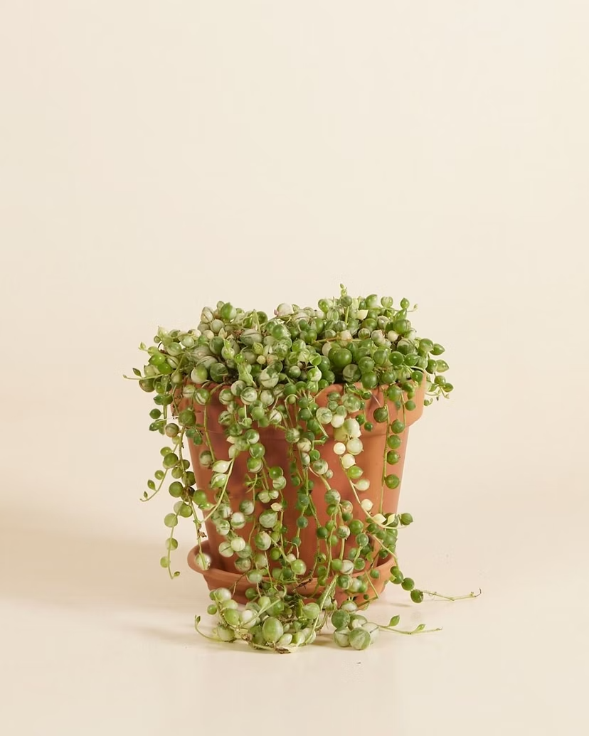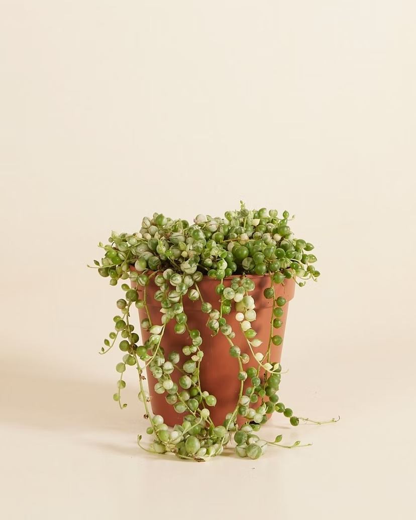 Meet the showstopper of the String of Pearls family—the variegated edition! While her classic cousin rocks solid green pearls, this beauty flaunts striking white stripes that make her absolutely pop. She's the same trailing superstar you love, just with extra pizzazz. Drape her from a shelf, let her cascade from a cabinet, or hang her in a macramé holder—however you style her, she'll steal the spotlight and bring joy to your space.
